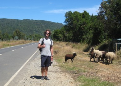 Justin attempts to get us a ride on the long walk back to Valdivia…we had seen nothing but these sheep for 45 minutes.
